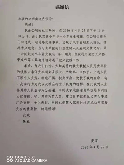 事后,經我們打聽,方知英勇的救火救援人員是貴單位的鐵保宏泰保安公司劉舟隊長、嚴蝴鵬、江偉明,上述人員不顧個人安危,臨危不懼,挺身而出,挽救了我的生命。這一高尚行為為我以及社會樹立了良好的榜樣,在此我對以上英勇的人員表示萬分感謝,同時誠摯地感謝貴單位培養訓練出這樣德、智、勇的英勇人員,建議貴單位把見義勇為事跡廣為宣傳,予以表彰,同時也提醒大家時時注意機動車駕駛安全的重要性。特此感謝!
