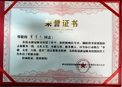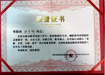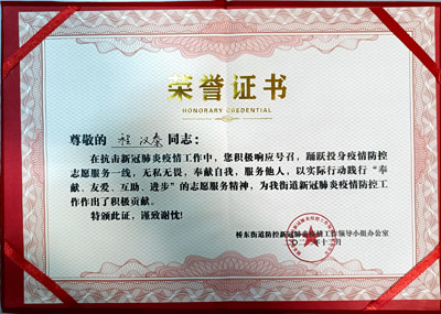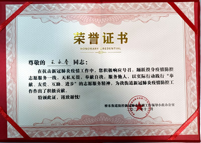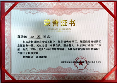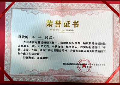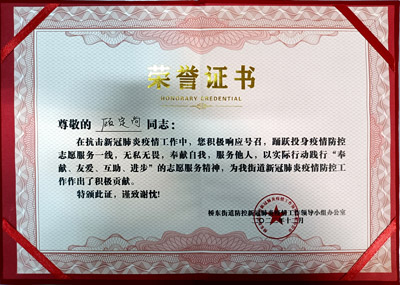 熱烈祝賀我司鐵保宏泰深圳保安公司的優(yōu)秀安保護(hù)衛(wèi)人員在抗擊新冠肺炎疫情工作中,積極響應(yīng)號召,踴躍投身疫情防控志愿服務(wù)一線,無私無畏,奉獻(xiàn)自我,服務(wù)他人,以實際行動踐行“奉獻(xiàn)、友愛、互助、進(jìn)步”的志愿服務(wù)精神,為我街道新冠肺炎疫情防控工作作出了積極貢獻(xiàn)。特頒發(fā)榮譽(yù)證書。