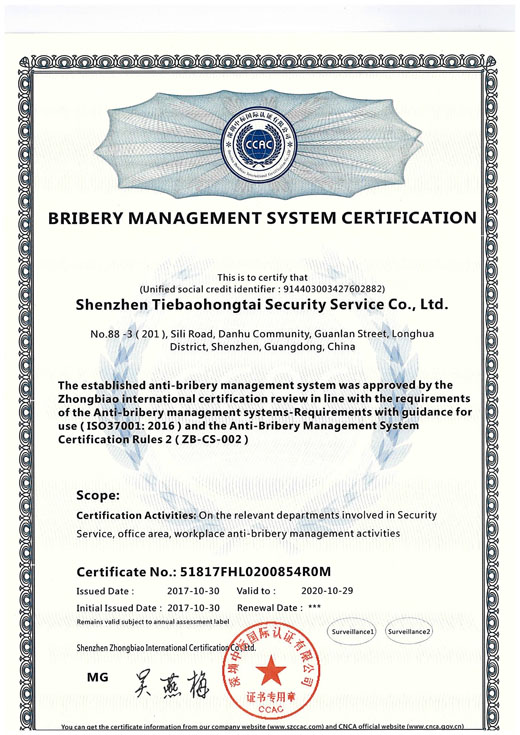 熱烈祝賀我司深圳鐵保宏泰保安服務有限公司榮獲反賄賂管理體系認證證書。