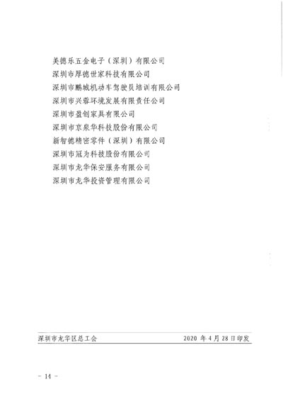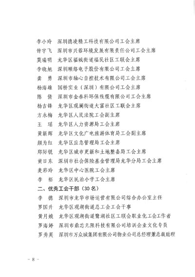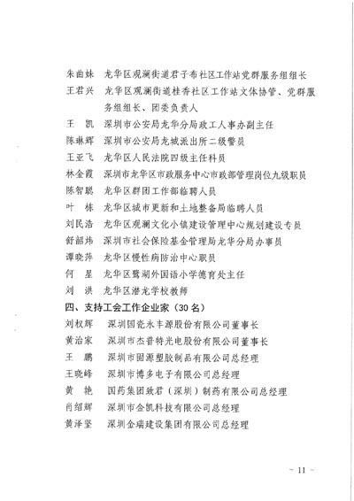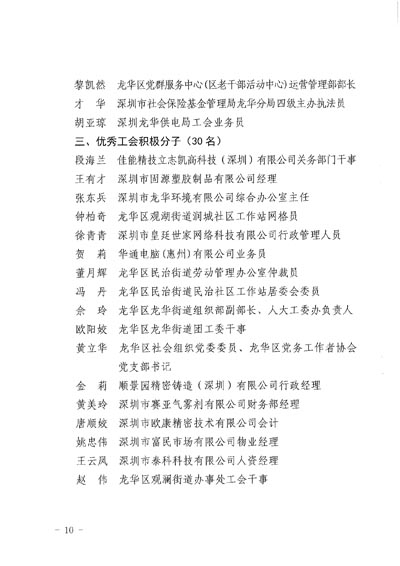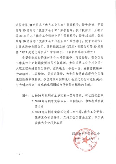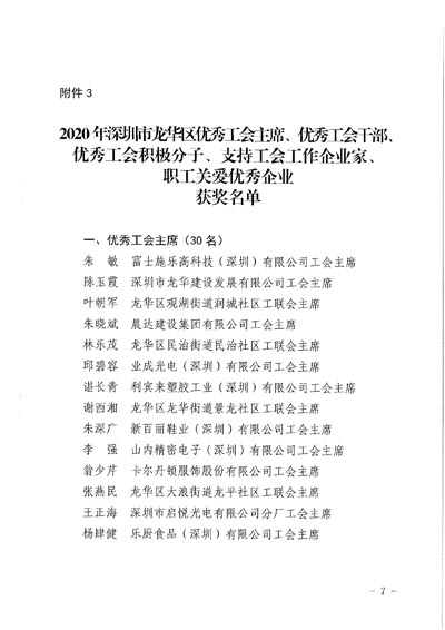 3.2020年深圳市龍華區(qū)優(yōu)秀工會(huì)主席、優(yōu)秀工會(huì)干部、優(yōu)秀工會(huì)積極分子、支持工會(huì)工作企業(yè)家、職工關(guān)愛(ài)優(yōu)秀企業(yè)獲獎(jiǎng)名單。